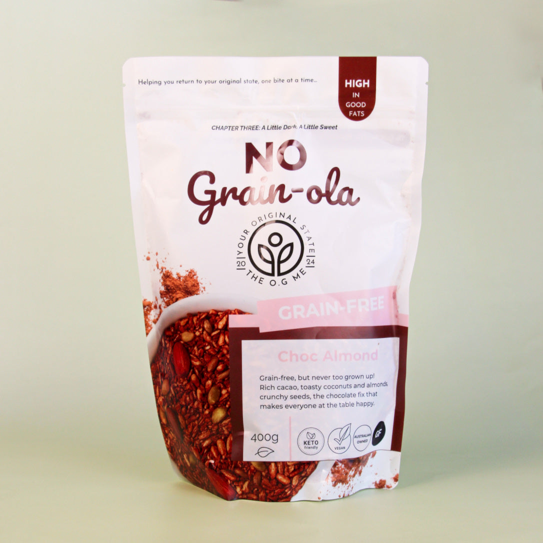 No Grain-ola™ Choc Almond by The O.G Me is a deeply satisfying grain-free granola made with raw almonds, coconut, seeds and rich cacao. Free from grains, oats and refined sugar, this no grain granola delivers a chocolatey crunch without the guilt. Ideal for paleo, low-carb and whole-food lifestyles, indulgent, without compromise.